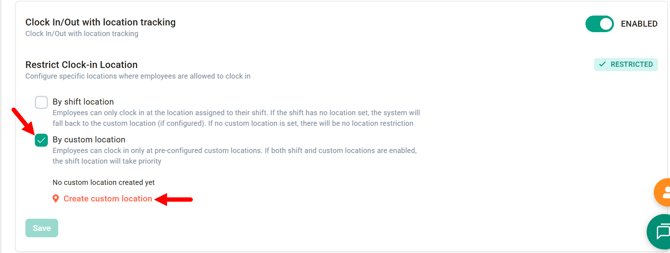 - Employees can clock in at any pre-configured custom location set in the policy.