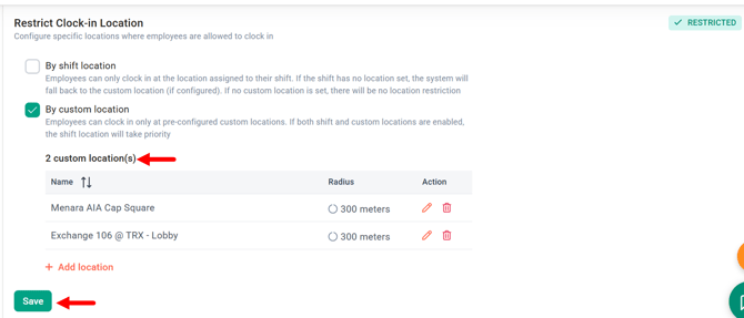 These shift locations will only apply if you enable Restrict Clock-in Location > By Shift Location in the Time Attendance Policy.