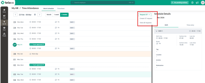 3. Click on the Request OT dropdown, then click on Create OT request