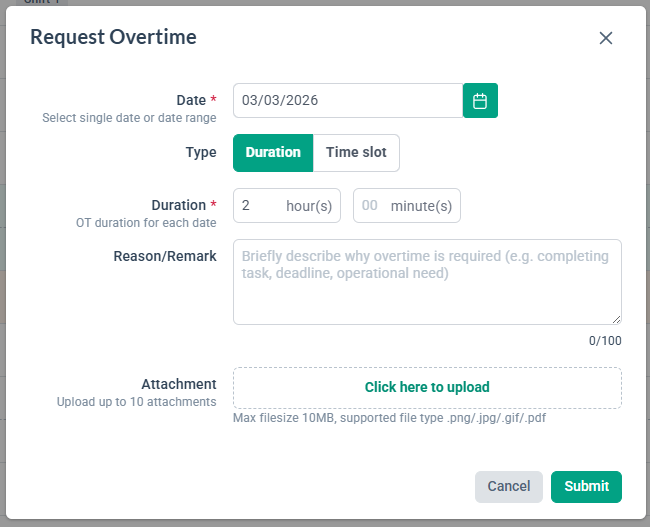 4. Fill in the required information such as the Date and Duration of the Overtime, if you have any Reasons/Remark and Attachments, be sure to have this information filled in as well