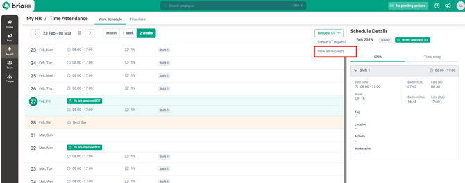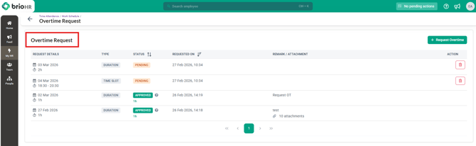 6. You will be able to refer to the Request List of all Overtime submissions , click on the Request OT dropdown and choose View All Requests