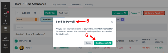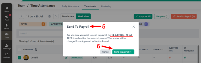 5. A confirmation pop-up message appears to confirm sending the specific period (e.g., 14 Jul 2025 - 20 Jul 2025) to payroll.