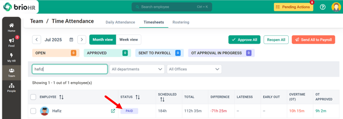 Once the payroll cycle is closed, the timesheet status in the Time Attendance module changes from Sent to Payroll to Paid.