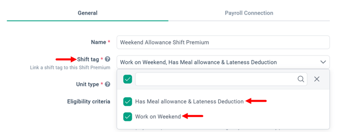 You can link to multiple tags in one Shift Premium and Deduction creation