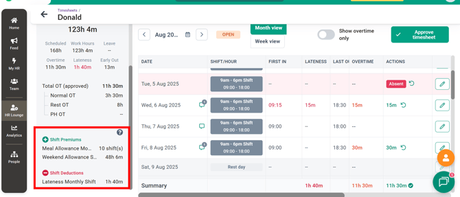 How Shift Premiums and Deductions Appear in Timesheet