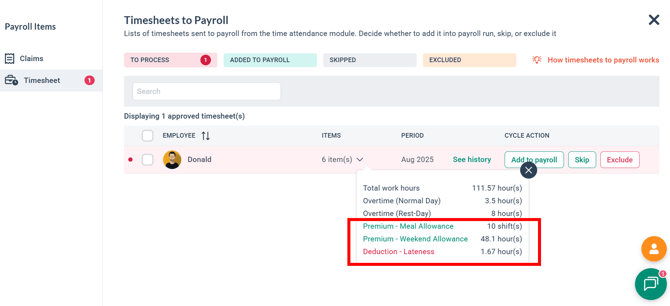 A: The final calculation is visible in Payroll after the approved timesheet is set from Time Attendance.