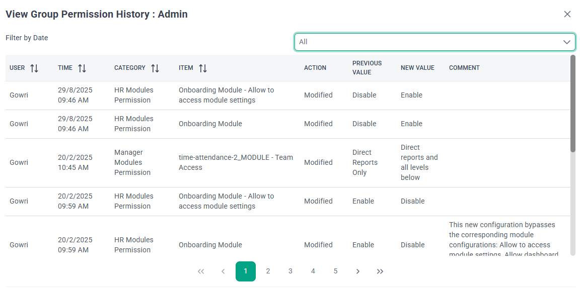 In BrioHR, keeping track of user access modifications is essential for maintaining system security and ensuring compliance. With the Modification History feature, Admins can easily review changes made to user access settings, including updates to User Groups and permissions.